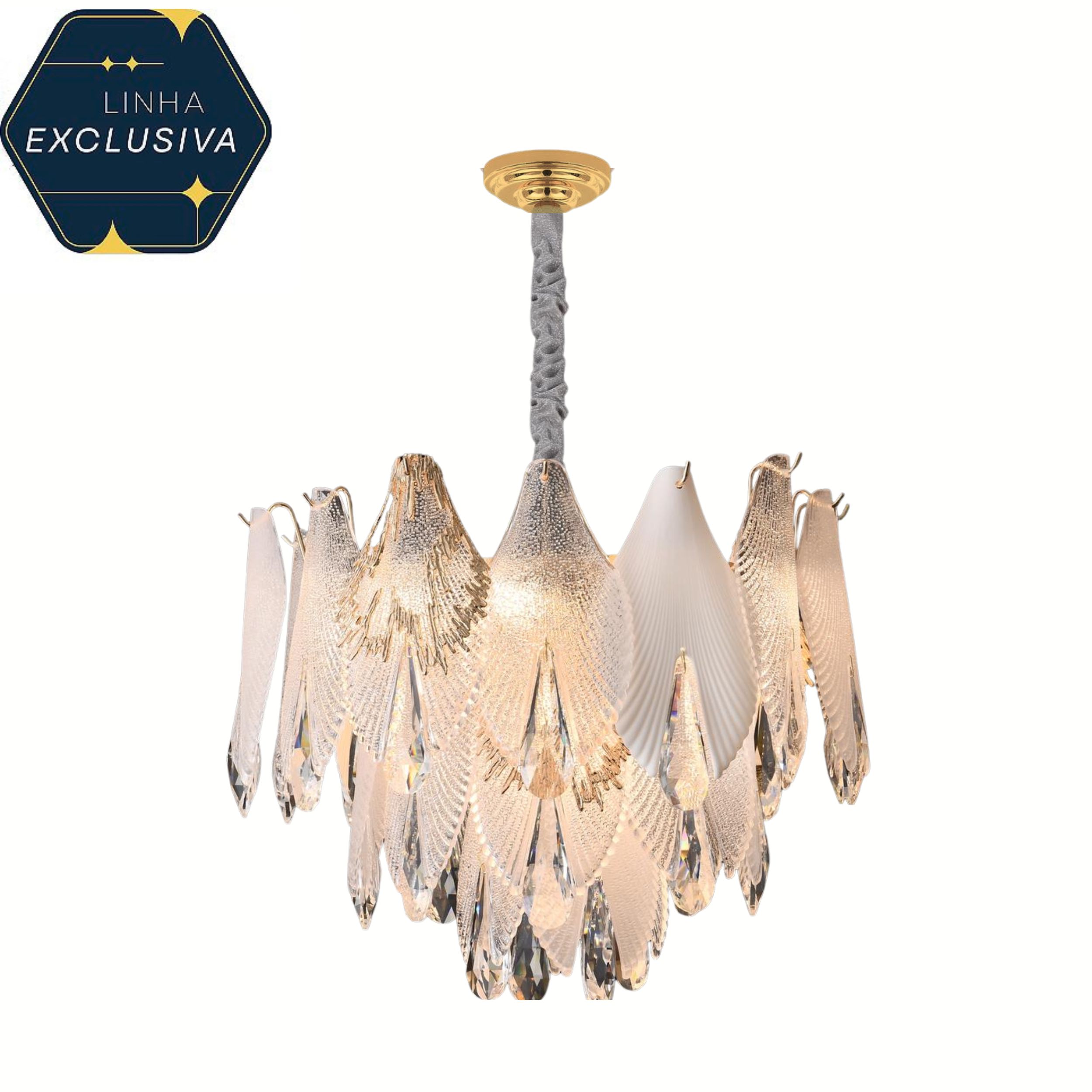 O Lustre HPD4360 é uma peça contemporânea que combina brilho e elegância em perfeita harmonia. Sua estrutura dourada é adornada por delicadas conchas de vidro com detalhes em cristal, dispostas lado a lado, criando um efeito visual luxuoso e envolvente. O design moderno e equilibrado transforma o ambiente com uma iluminação suave e sofisticada, ideal para salas de jantar, estar ou halls de entrada.