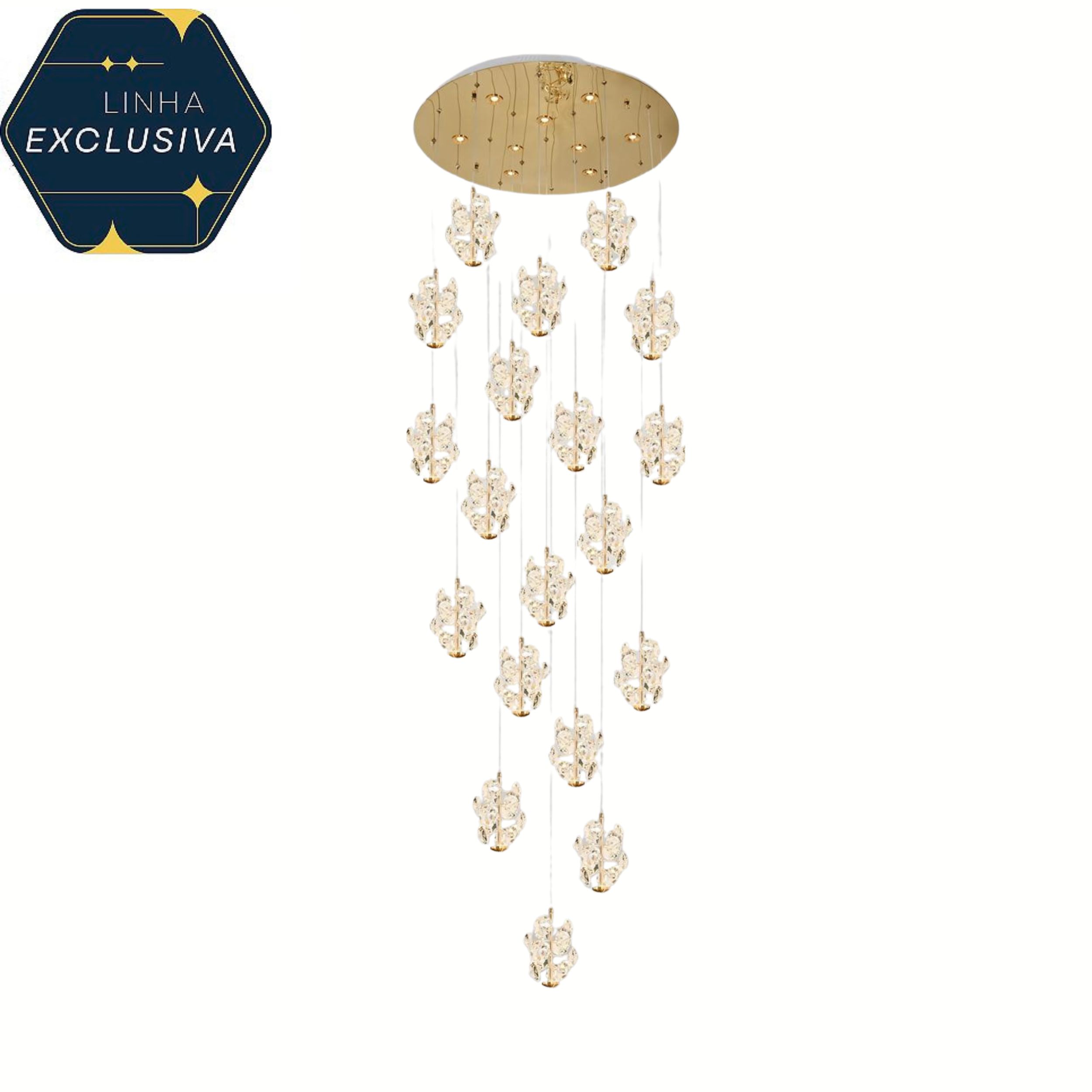 O Pendente HPD4347 é uma peça majestosa que traduz elegância e modernidade em cada detalhe. Com uma base de 80 cm e delicadas peças em cristal suspensas em diferentes alturas, ele cria um efeito de cascata luminosa, ideal para ambientes com pé direito alto. Seu design imponente reflete a luz de forma suave e envolvente, proporcionando uma atmosfera sofisticada e acolhedora. O LED 3 cores permite ajustar o tom da iluminação conforme o clima desejado.