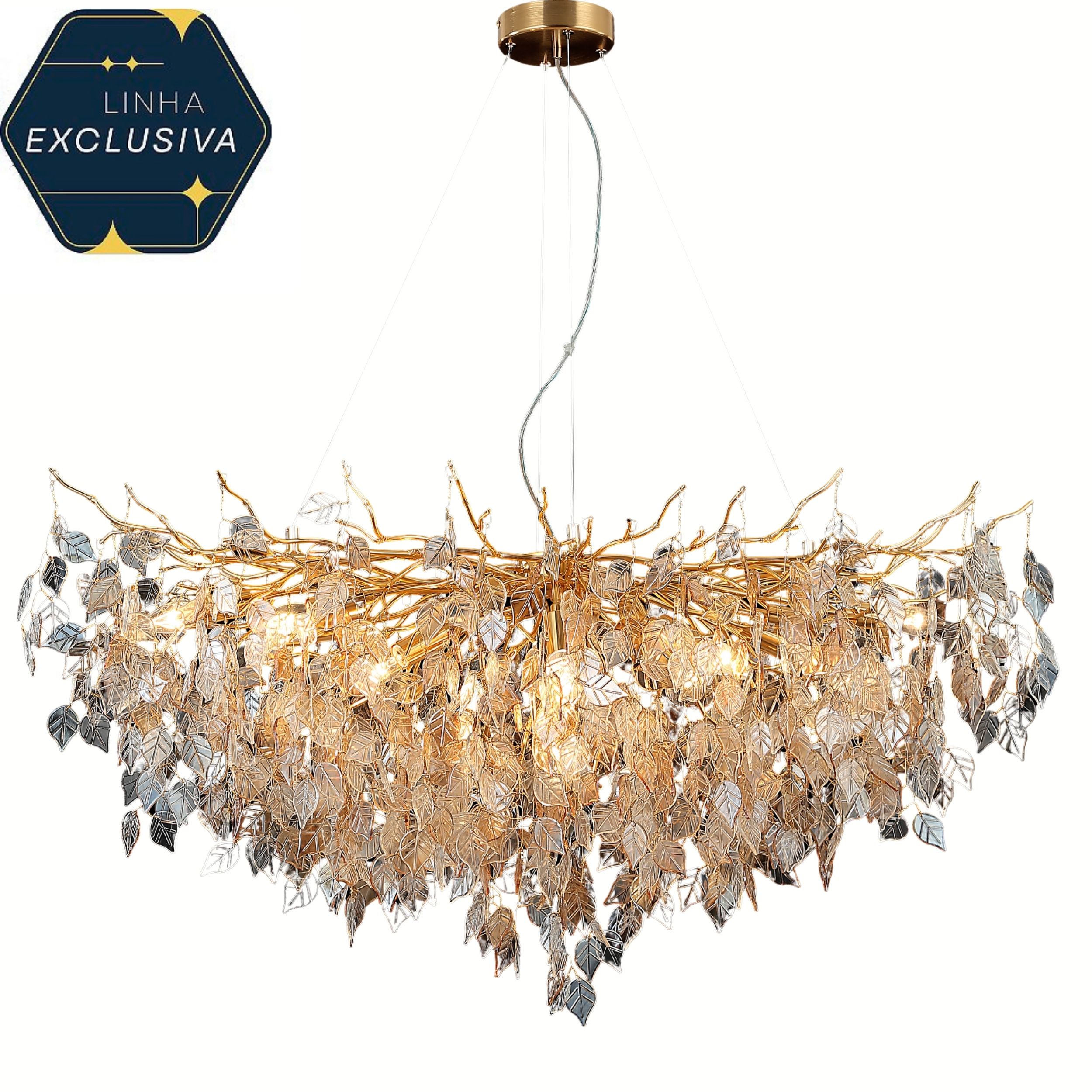 O Pendente HPD9111 é uma peça sofisticada e imponente, que une arte e iluminação em um design inspirado na natureza. Com estrutura dourada e folhas de vidro em tons âmbar e transparentes, ele remete a um galho repleto de folhas iluminadas, criando um efeito visual encantador. Ideal para salas de jantar ou ambientes amplos, proporciona um toque de luxo e elegância incomparável.